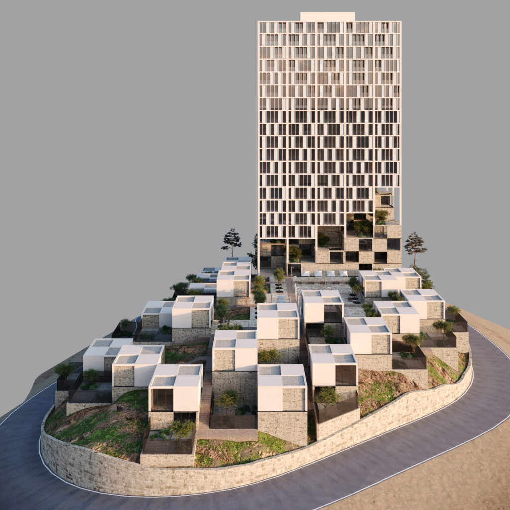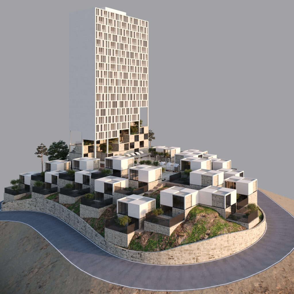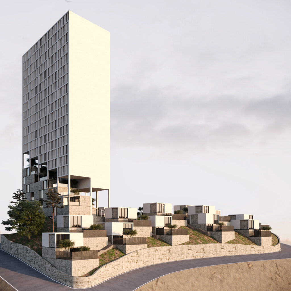 In pursuit of a balance between density and human scale, the idea emerged to carve away part of the tower’s volume and let the subtracted masses settle along the hillside — as if the scattered villas around were fragments of the main body extending into the landscape.