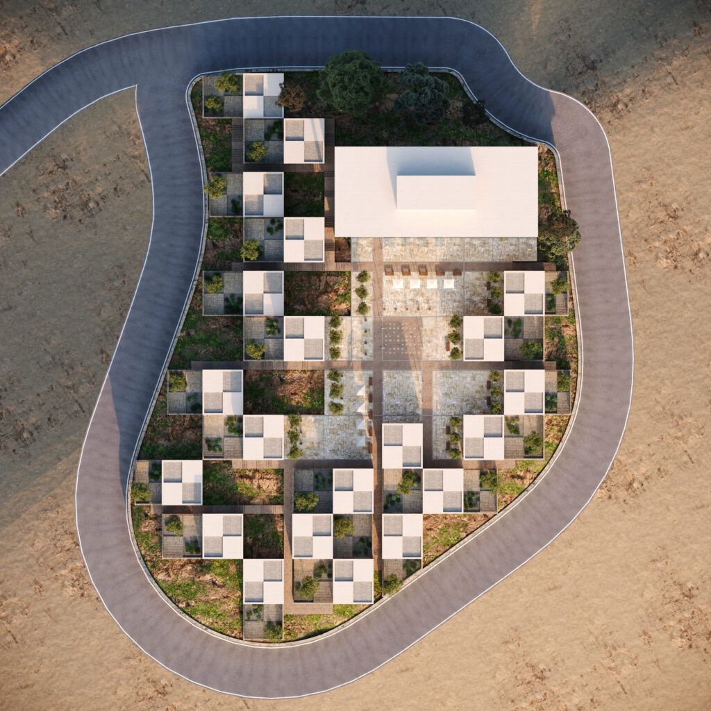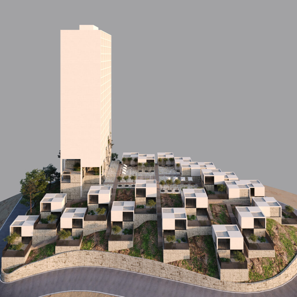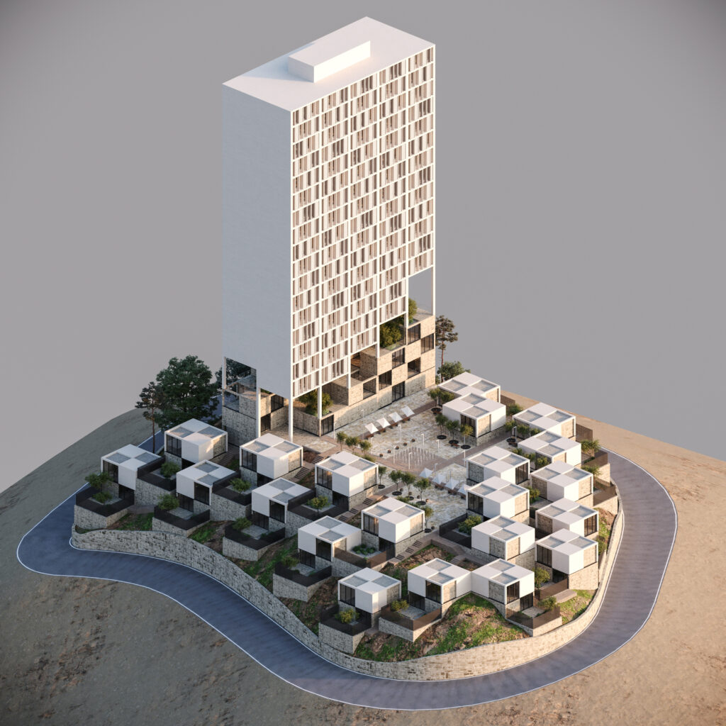In pursuit of a balance between density and human scale, the idea emerged to carve away part of the tower’s volume and let the subtracted masses settle along the hillside — as if the scattered villas around were fragments of the main body extending into the landscape.