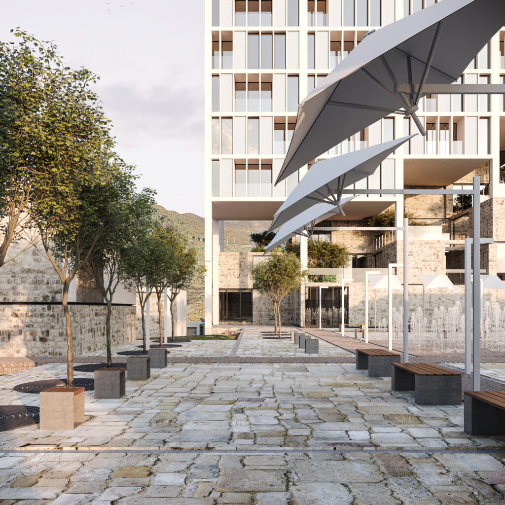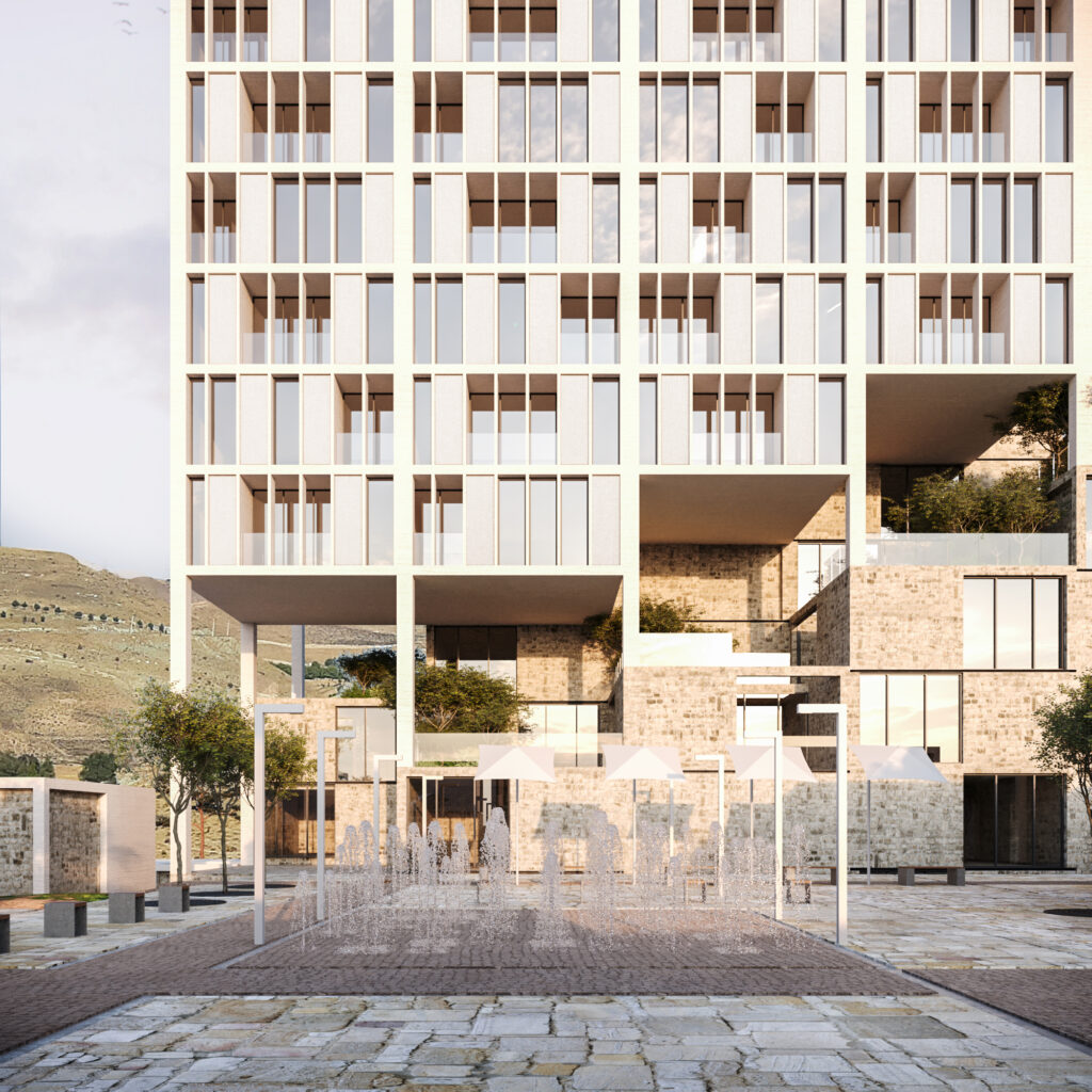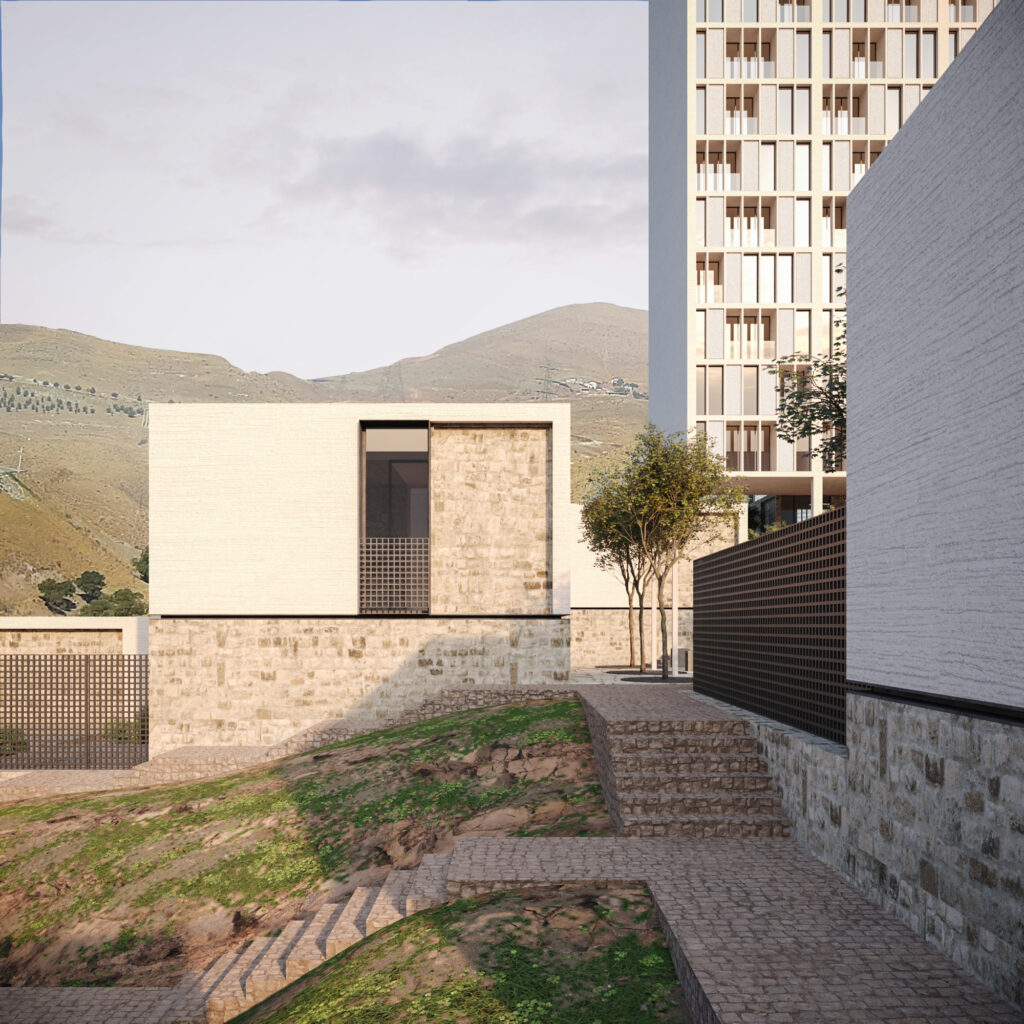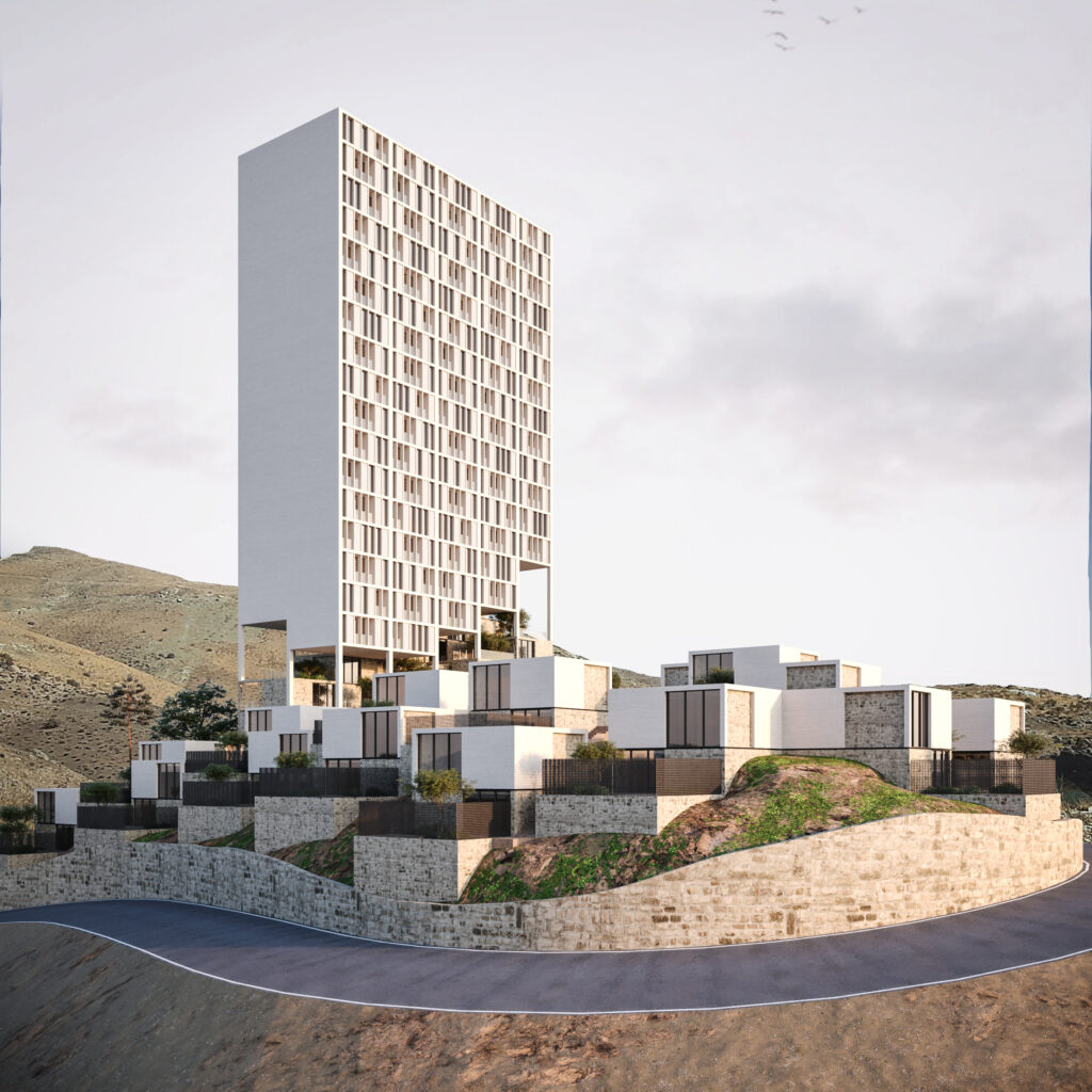 Thus, the tower rises from the earth, and the villas stretch across it — two expressions of a single architectural logic that meet and intertwine at the neighborhood’s center.